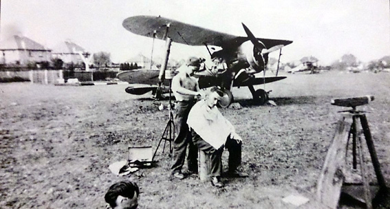 Here Aircraftsman Lloyd gives a haircut alongside a Gloster Gladiator.