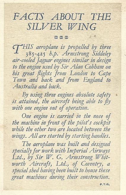 'Croydon - Paris' flight was called the 'Silver Wing Service'. |