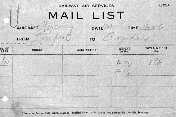 (above) Mail list for flight Liverrpool to Croydon on 22nd