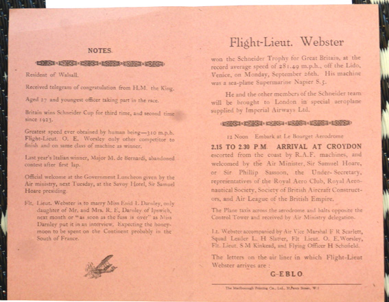 conveying Scneider Trophy winner Fl Lt Webster escorted by R.A.F